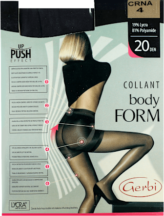 Gerbi BODY FORM 20 DEN hulahop čarape sa push-up efektom. Glatke i elastične nogavice sa ojačanjem na prstima prikazuju Vaše noge u punom sjaju, dok je gornji deo hulahopa izrađen od debljeg materijala i upotpunjen korektivnim ojačanjima na zadnjici i stomaku